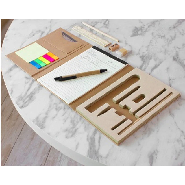 15 x 21 x 2.4 cm. (cerrado) y 48 x 21 cm. (abierto). Cartón kraft de gran firmeza. Cuaderno anotador múltiples funciones. El kit contiene: un bloc de hojas rayadas con fecha y dia de la semana, regla de madera, regla de pvc, dos lápices negros, goma de borrar, sacapuntas y bolígrafo tinta negra. Ademas un set de Post- it cuadrados amarillos y tiras plásticas autoadhesivas de diferentes colores (azul, verde, amarillo, rosa y naranja). El cierre del cuaderno es con una banda elástica de color negro que permite una buena sujeción.