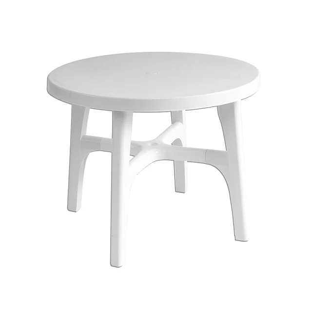 Mesa Plástica redonda modelo "Roma" de Polipropileno. Cuenta con base de 4 patas desarmables adosadas (unidas entre sí), lo que le da una resistancia y estabilidad superior a los modelos nacionales, con topes anti-deslizantes en las 4 patas. Ideal para terrazas, jardines, playa o eventos. Puede usarse tanto en interiores como en exterior. Es muy liviana, pesa sólo 5.6 kgs. y como es desarmable, ocupa poco espacio y es muy fácil de trasladar y guardar en grandes cantidades. Fácil de lavar. Producto importado de calidad superior.