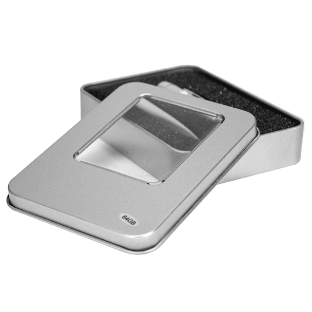 USB Bolígrafo metálico ejecutivo, con memoria de 64GB y Puntero Láser. Presentación en elegante estuche de aluminio con ventana, dentro de cuna de esponja EVA negra. Logo grabado laser